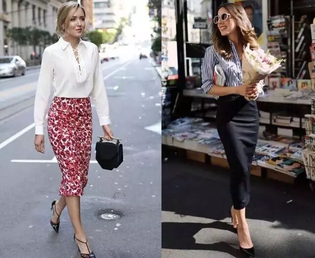 如果是更正式的场合建议选择包臀的一步裙,这样会让你的整体造型更富有优雅风情。纯色的衬衫就需要选择花色半裙去协调,切记上下都“花里胡哨”,会造成视觉上的“凌乱感”,阻碍你打造干练利落的职场造型。