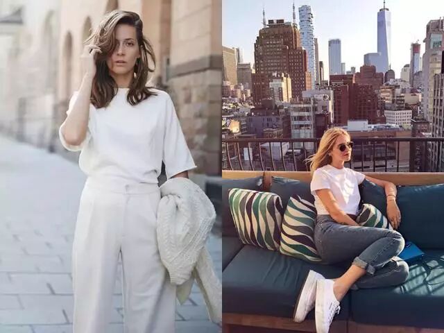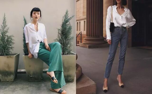 纯白的衬衫还可以搭配裤装,但是不是西装裤,是阔腿裤和修身的牛仔裤。阔腿裤会带来简洁干净的即视感,而搭配修身的牛仔裤和尖头鞋会让你的造型更富有气场和提升整体的“干练度”。
