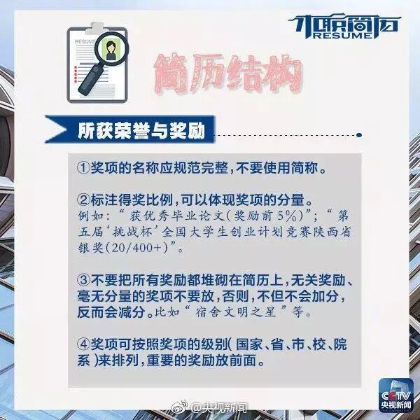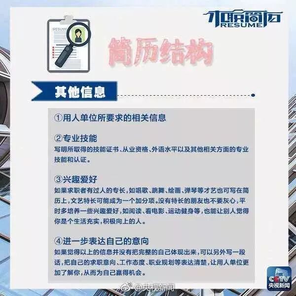 要记住你的个人简历必须突出重点,它不是你的个人自传,与你申请的工作无关的事情要尽量不写,而对你申请的工作有意义的经历和经验绝不能漏掉。